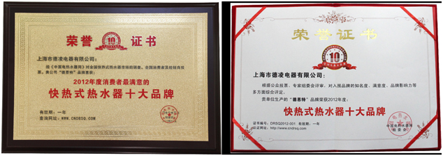 經(jīng)“中國電熱水器網(wǎng)”(www.cndrsq.com)對全國快熱式電熱水器市場的調(diào)查以及全國消費(fèi)者和經(jīng)銷商的投票,德恩特快熱式電熱水器獲得“2012年度消費(fèi)者最滿意的快熱式熱水器十大品牌”,并榮獲第一名。